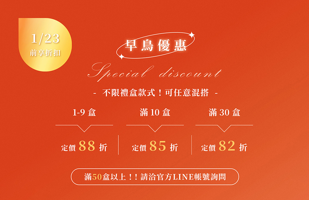 【新年禮盒早鳥】1/23前任選單件88折、滿10件85折、滿30件82折 on selected categories